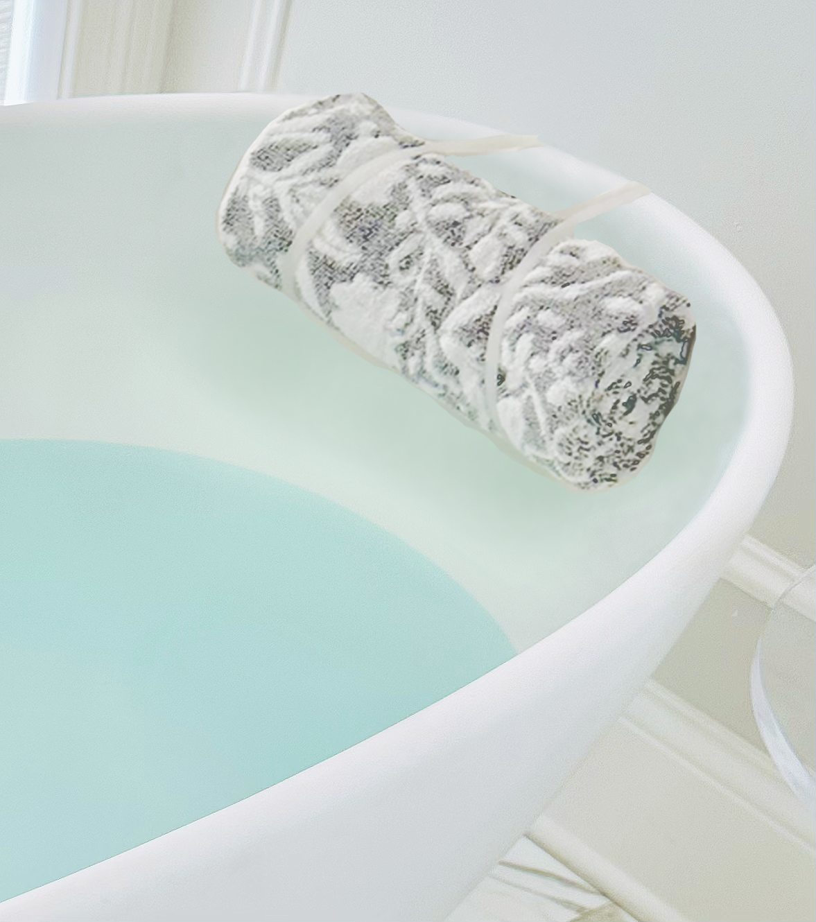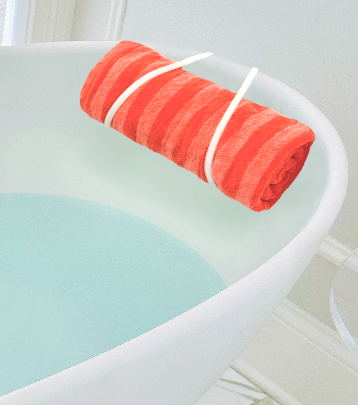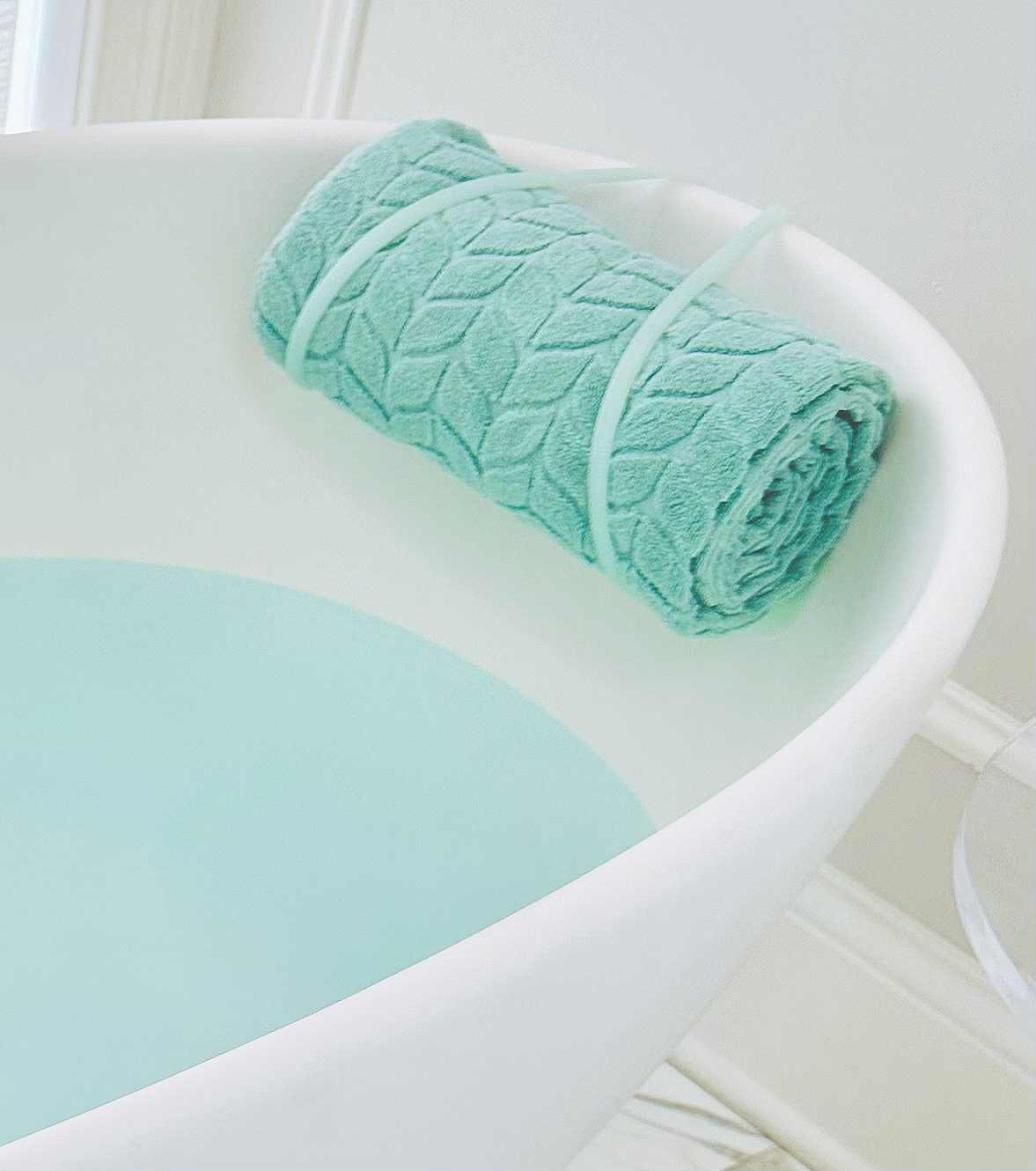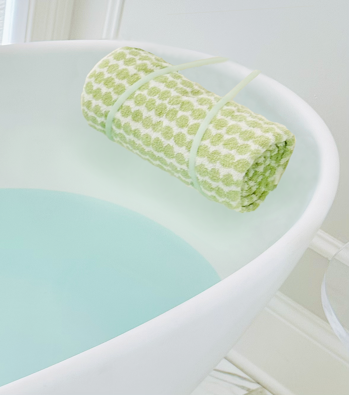 The Bath Bolster® is designed to secure a rolled towel to the bathtub to comfortably support your neck while reclining in the bath. Made with anti-microbial silicone, the Bath Bolster® resists mold and mildew and is dishwasher safe. Good bye to cheap, moldy bath pillows that get tossed over time. Pro Tip: Heat or chill your towel for a luxurious spa-like sensation.